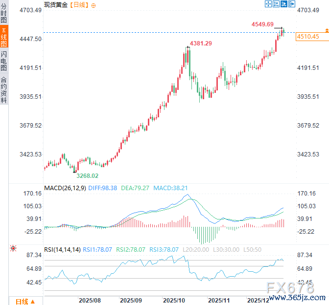 美国总统特朗普上周日(12月28日)表示,在佛罗里达州与乌克兰总统泽连斯基会晤后,旨在结束俄乌冲突的谈判已取得进展,但特朗普承认双方在领土问题上仍存在棘手分歧。黄金的避险溢价面临回吐压力,周一亚市时段,现货黄金震荡走低,目前交投于4515美元/盎司附近,跌幅约0.31%,但仍处于较高点,位于历史高点(4549.69)附近下方不远处。